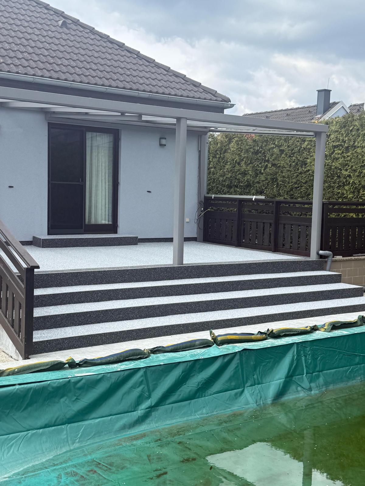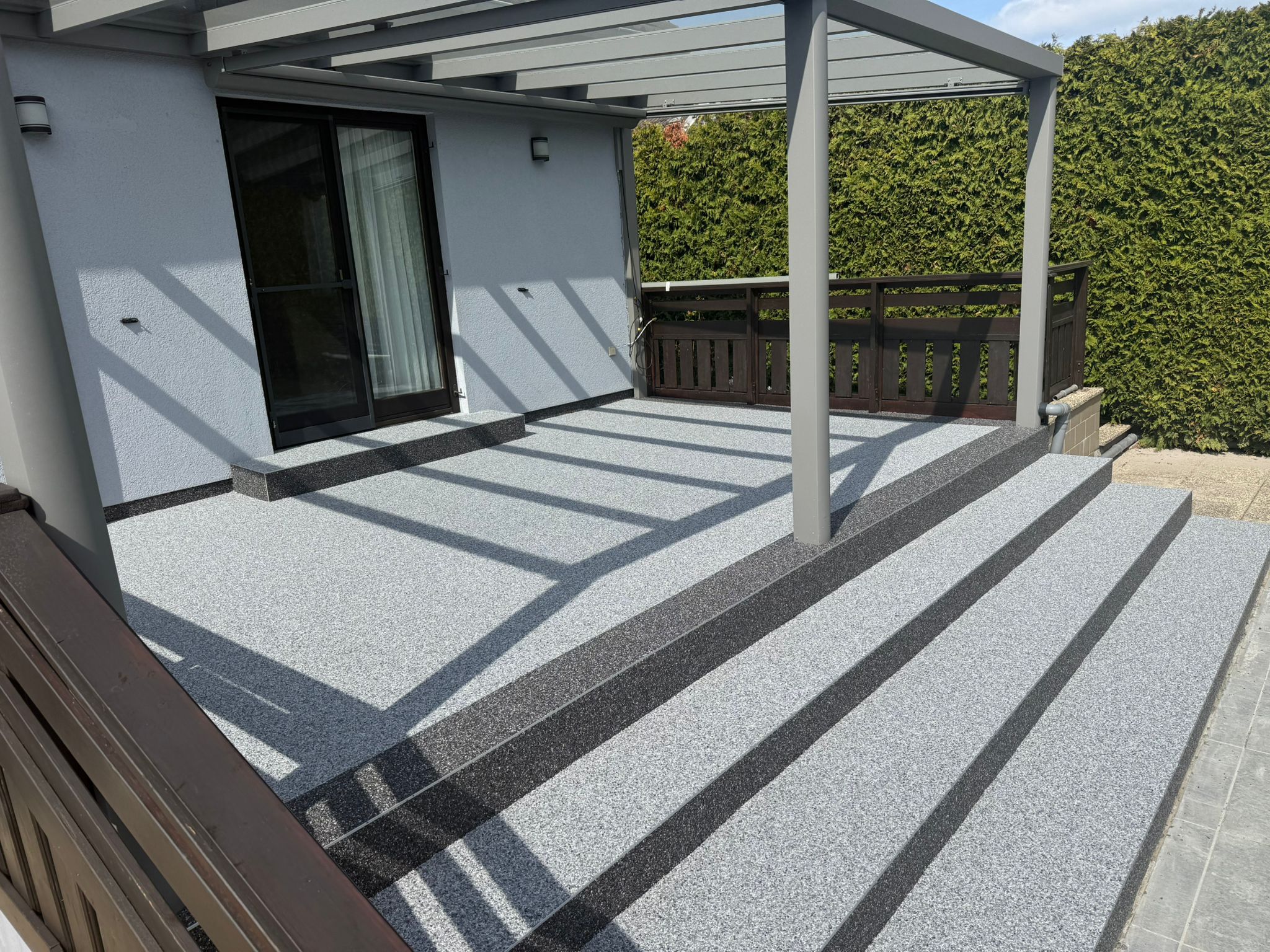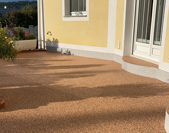 Der Steinteppich ist ein moderner Bodenbelag aus Naturstein oder Marmorkies, gebunden mit speziellen Harzen. Das Ergebnis ist eine fugenlose, langlebige und ästhetische Oberfläche – ideal für Terrassen, Treppen, Balkone, Pools und Poolumrandungen oder Flure sowie gewerbliche Flächen, sowohl im Innen- als auch im Außenbereich.